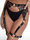 Гартеры резные изготовлены из черной натуральной кожи и дополнены золотой фурнитурой высокого качества. Ремешки соединены между собой кольцами. Благодаря большому диапазону регулировок гартеры великолепно будут смотреться практически на любой фигуре. Высота посадки на бедрах также регулируется ремешками. Доставляется в фирменной упаковке в виде брендированной деревянной коробки.