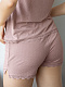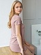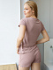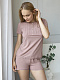 Женский домашний комплект-пижама: футболка с коротким рукавом и шорты на резинке. Идеален для сна, а также в нем можно выйти к завтраку в узком семейном кругу. Приятная к телу ткань на основе вискозы, дымчато-сиреневого цвета, имеет утонченный рисунок в виде мелких перфорированных ромбиков. Вырез горловины футболки и кокетка, а также низ шорт отделаны кружевом в тон. Вертикальные защипы на груди образуют манишку, украшенную планкой с блестящими пуговками – имитацией застежки. Шорты имеют разрезики в боковых швах для удобства посадки и свободы движений. В комплекте: футболка, шорты.