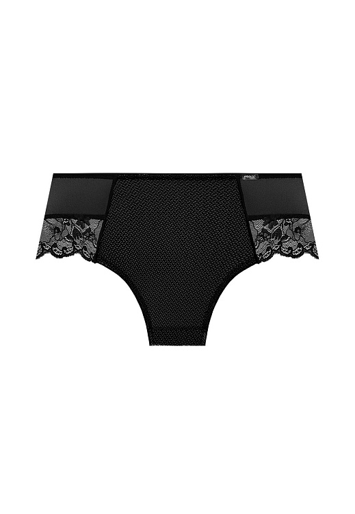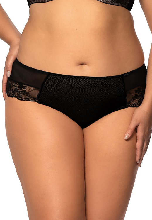 Трусики-бразилиана Estera выполнены из фактурной эластичной сетки, продублированы спереди микрофиброй, спинка из сетки и широкого кружева. Ластовица из 100% хлопка.